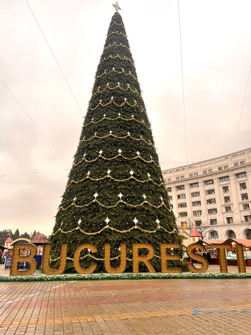 bucuresti sign in front of a tall Christmas tree in Constitution Square in Bucharest