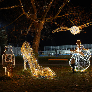 Stroll through the light displays at the city park, guaranteed to entertain young and old. In 2024, this area featured displays such as Little Red Riding Hood, Cinderella, the gingerbread man, and more.